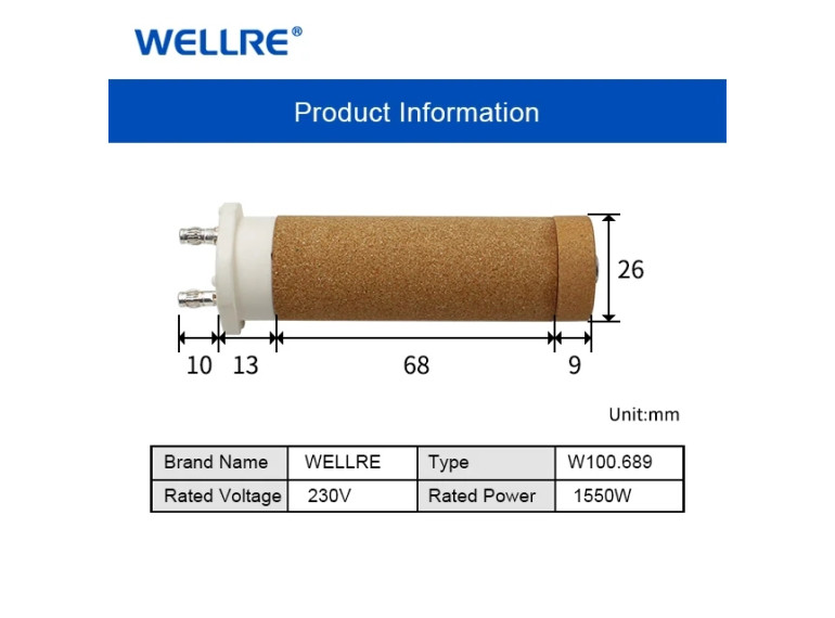 Керамічний нагрівальний елемент Wellre 100.689 — сервісний нагрівальний елемент підвищеної надійності для ручних гарячоповітряних апаратів типу Leister Triac S. Працює від 220 В, потужність 1550 Вт. Відрізняється високою продуктивністю, швидким виходом на робочу температуру та довгим строком служби порівняно зі звичайними ТЕНами.